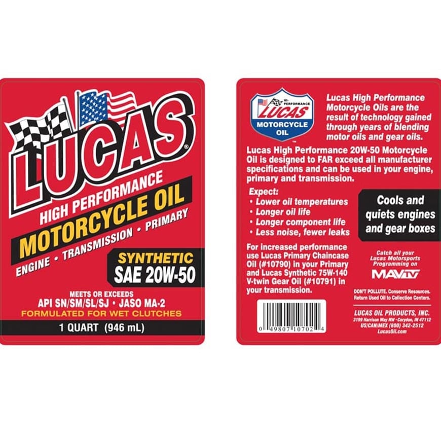 هذه زيوت سباق حقيقية تتجاوز جميع مواصفات الشركات المصنعة بكثير ويمكن أن تدوم لفترة أطول من الزيوت الأخرى حتى 4 مرات على حلبات السباق أو في الشوارع.صُممت زيوت لوكاس للدراجات النارية لتحمل الاستخدام لفترات طويلة تعمل هذه الزيوت على خفض درجة حرارة الزيت وإطالة عمر المكونات الحيوية وتقليل الضوضاء والتسربات وتحسين الأداء.