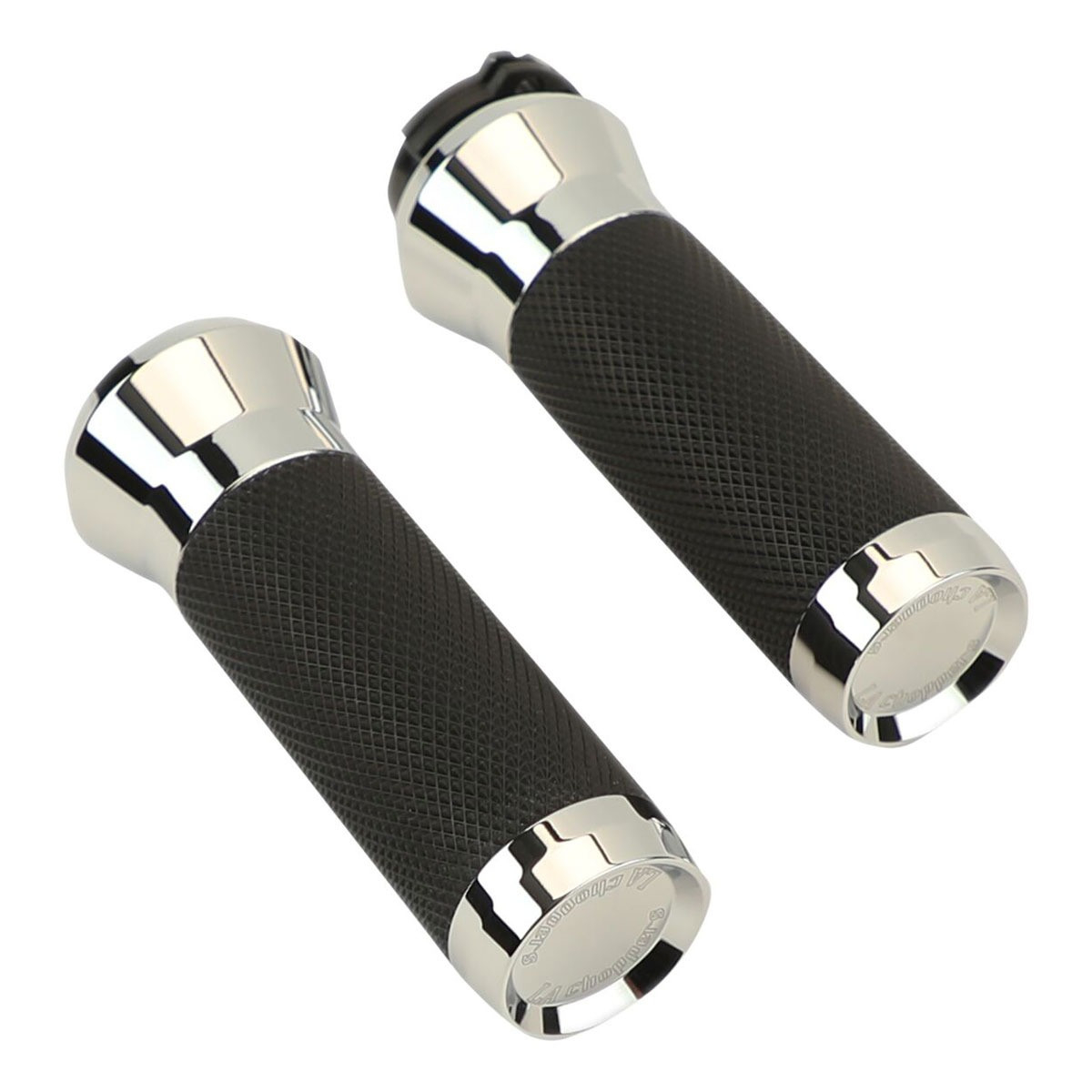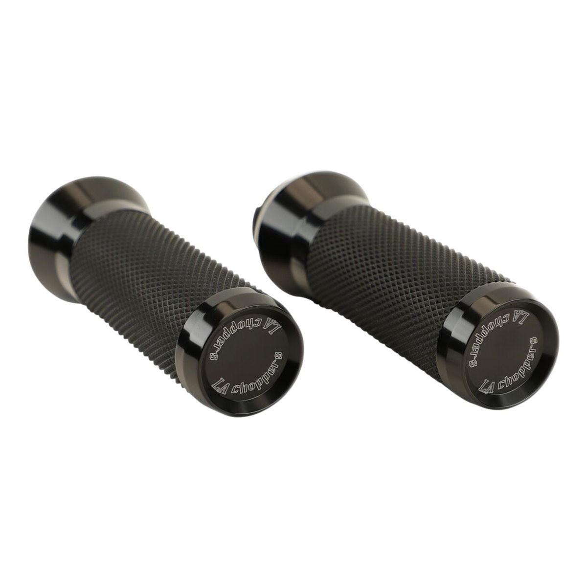 صممت LA Choppers زوجًا من المقابض التي تبدو رائعة وتعمل أيضًا بسطحها المطاطي المحكم. • شعار LA Choppers على الغطاء النهائي