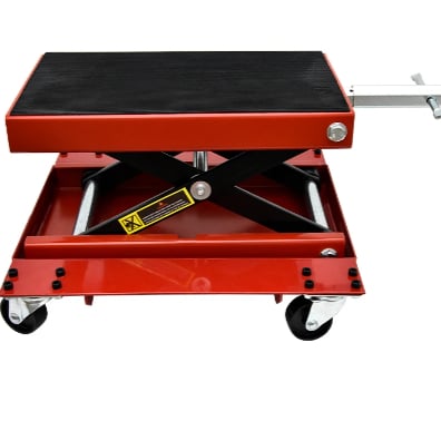 جاك دراجة نارية بايل مع دوللي - محطة إصلاح الدراجات النارية/جاك - محطة خدمة للدراجات النارية مع دوللي - يرفع دراجة نارية للخدمة والصيانة - هيكل فولاذي شديد التحمل مع لمسة نهائية من مسحوق أسود - بطانة مطاطية سميكة بسمك 1/4 بوصة تحمي إطار الدراجة النارية - رافعة سفلية للتخزين لضغط ارتفاع 3-11/16 بوصة بدون دوللي - تشغيل مقبس 7/8 بوصة (مفتاح ربط، سقاطة، أو أداة هوائية) - يتضمن طراز دوللي أربع عجلات فولاذية، ويتطلب بعض التجميع - سعة الحمولة: 1100 رطل - حجم محطة العمل: 23*37 سم.