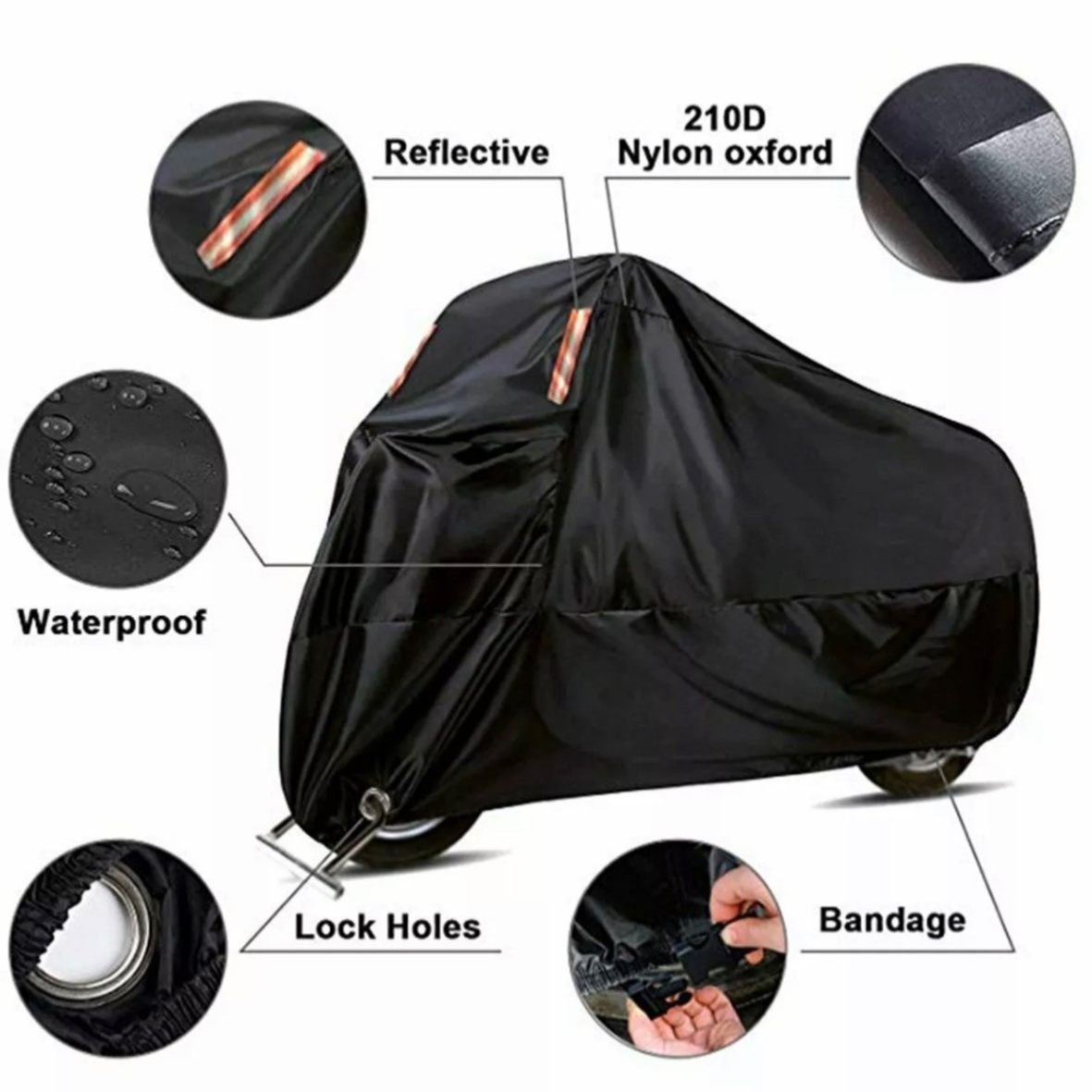 غطاء متين للدراجة النارية مصنوع من مادة أكسفورد نايلون 210D ، قوة تمزق عالية ، يحمي دراجتك النارية من المطر ، والغبار ، والحرارة ، ونسغ الأشجار ، والأشعة فوق البنفسجية الضارة ، ويبقيها دائمًا في حالة جيدة.