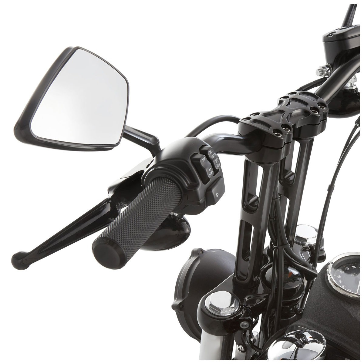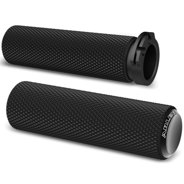 • المقابض بقطر 1 بوصة مصنوعة من الألمنيوم والمطاط المؤكسد ، مع غطاء طرفي مصنوع من المعدن يحمل شعار Arlen Ness المحفور بالليزر