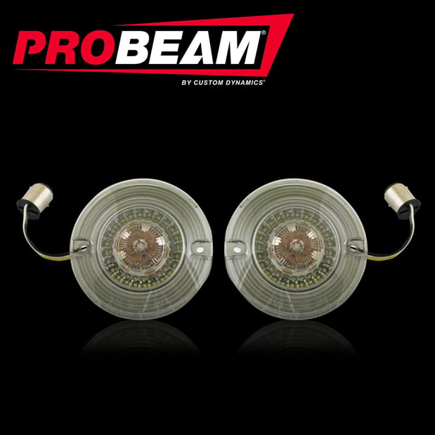 تعمل إشارات الانعطاف للدراجات النارية ProBEAM® LED على زيادة الأداء إلى أقصى حد من خلال تقنية عاكسة فريدة ومصابيح LED من فئة السيارات مكونة في وحدة محكمة الغلق لتحقيق موثوقية فائقة. تعرض الحلقة الخارجية المكونة من 24 مصباح LED أبيض هالة بيضاء ناعمة 6000K تعمل كمصباح تشغيل بينما تعمل 12 مصباح LED كهرماني مركزي كإشارة الانعطاف. عند تنشيط إشارة الانعطاف، تنطفئ مصابيح LED البيضاء تمامًا طوال دورة إشارة الانعطاف بأكملها مما يوفر رؤية أفضل لإشارة الانعطاف باللون الكهرماني.