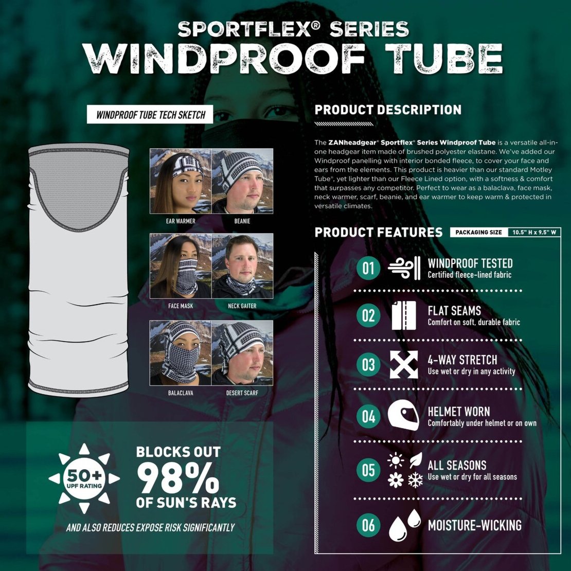 غطاء الرأس ZANheadgear® SportFlex™ Series المقاوم للرياح هو غطاء رأس متعدد الاستخدامات، مصنوع من البوليستر الإيلاستين والمعالج بالفرشاة. أضفنا ألواحنا المقاومة للرياح الرائعة مع صوف داخلي مُلصق، لتغطية وجهك وأذنيك من العوامل الجوية. هذا المنتج أثقل من غطاء Motley Tube القياسي، ولكنه أخف من خيارنا المبطن بالصوف، مع نعومة وراحة تتفوق على أي منتج منافس. مثالي للارتداء كقناع للوجه، أو قناع للوجه، أو دفاية للرقبة، أو وشاح، أو قبعة، أو دفاية للأذنين للحفاظ على الدفء والحماية في مختلف الظروف المناخية. خفيف الوزن وقابل للغسل في الغسالة، مقاس واحد يناسب معظم البالغين. حماية من الأشعة فوق البنفسجية حتى 50+. الخامات: 87% بوليستر، 13% إيلاستين، و100% بوليستر.