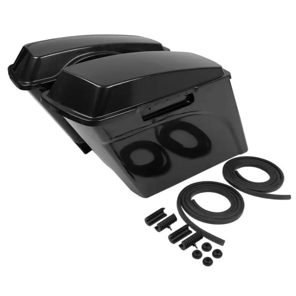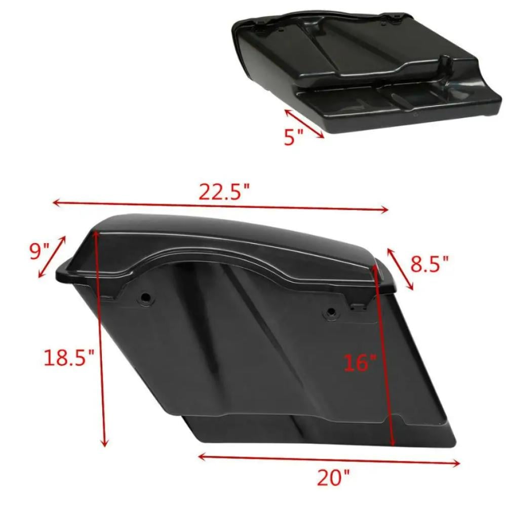 - Saddlebags are stretched 5" longer than stock to cover the muffler front to back and give that stretched look,Size:As picture Showed.(outside dimension measurements)