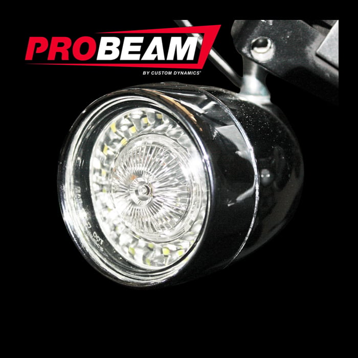 Kit includes ProBEAM® Dynamic Ringz™ front LED turn signals with white halo running light and full contrast amber turn signal, with smoked Bullet Bezel lens. Rear ProBEAM® Red turn signals with solid red turn signal illumination, with red Bullet Bezel lens. ProBEAM® Bullet Bezel turn signal lens finish is offered in your choice of chrome or gloss black.