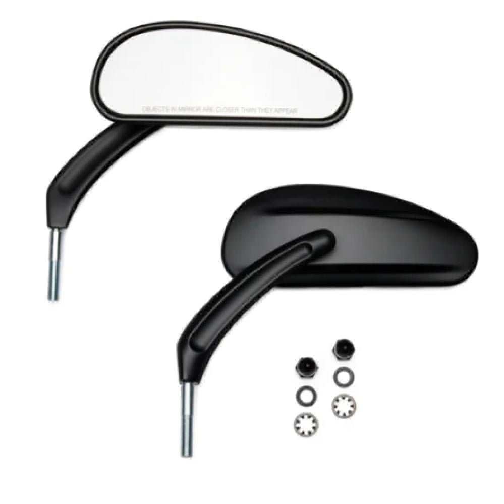 Harley-Davidson® Profile Custom Mirrors - Stain Black, 56000135. Fits '82-later models (except VRSCF, XG750A, '14-'16 FLHR, FLHRC and FLHRSE, '11-'13 FLHTCUSE,, '14-later FLHTKSE and '18-later FLTRXSE). Does not fit XL1200X models with mirrors mounted below the handlebar. These billet-style mirror feature a low-profile swept back design with a shape that tucks in close to the hand controls. Satin black with solid stem. Teardrop shape provides excellent rearward visibility. Slim lines add a true custom touch. Sold in pairs. Includes: Right and left mirrors and all necessary hardware. 1 year limited warranty. 56000135